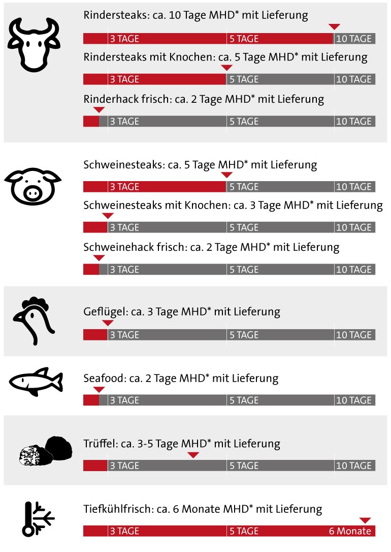 Damit du deine gekauften Produkte stets bedenkenlos und auf dem Höhepunkt ihres Geschmacks verzehren kannst, haben wir dir eine Tabelle angehängt, innerhalb welcher Zeiträume wir für die Frische und den optimalen Geschmack unserer Produkte garantieren. An dieser kannst du dich bei der Bestellung und Lagerung deiner Cuts und Bratenstücke orientieren, um stets die besten Ergebnisse zu erzielen! Wichtig: Wir empfehlen dir frische Stücke sofort nach Erhalt einzufrieren. Zudem übernehmen wir keine Haftung, sobald ein frisches Stück Fleisch selbst eingefroren wird. Bereits als TKF gelieferte Produkte können wie ausgezeichnet in der Gefriertruhe bei -18°C gelagert werden. Frische Stücke mit Knochen sollten nicht länger als 1-2 Monate eingefroren werden.